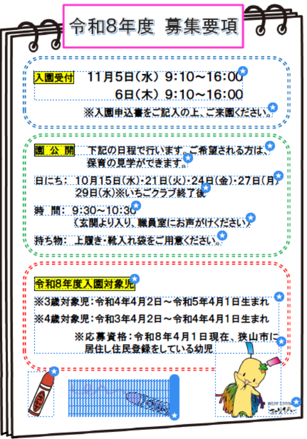 入間川幼稚園ホームページ移設のお知らせ 今後は以下のURLをご覧ください。 https://sayama-irumagawa-kindergarten.edumap.jp/ 更新日:令和7年2月3日 新型コロナウイルス感染症に関連する情報は 市役所のHPから(下の画像をクリックしてください)