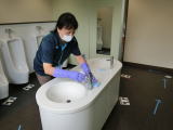 ![]() ☆下校後は、教室やトイレを職員が消毒しています。特に子供たちがよく触る机やイス、ドアなどは念入りに消毒しています。 |