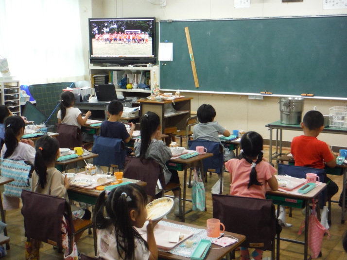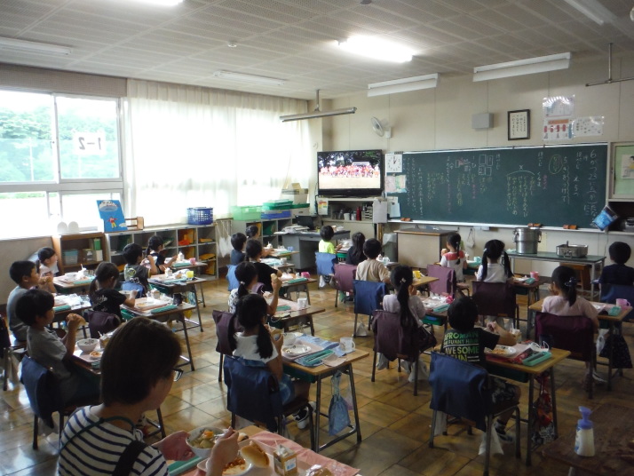 2年生から6年生がビデオ撮影、編集をして1年生の教室ビデオ上映の形をとりました。給食時間の上映で、みんな楽しそうでした。