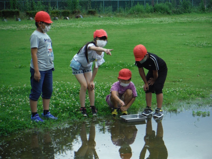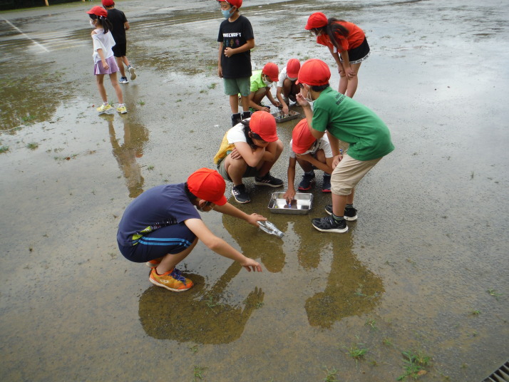 7月9日 新体力テスト実施中!頑張ってます。水たまりがいっぱいの校庭では、理科で地面の傾きを 確認中。方法は・・・ビー玉です。水が流れるのは・・・・・・・・!6年生は、「お気に入りの場所」をテーマに絵を描いています! 1年生が育てているアサガオも元気いっぱいです!!
