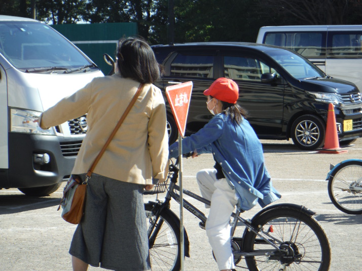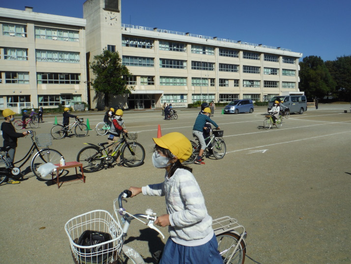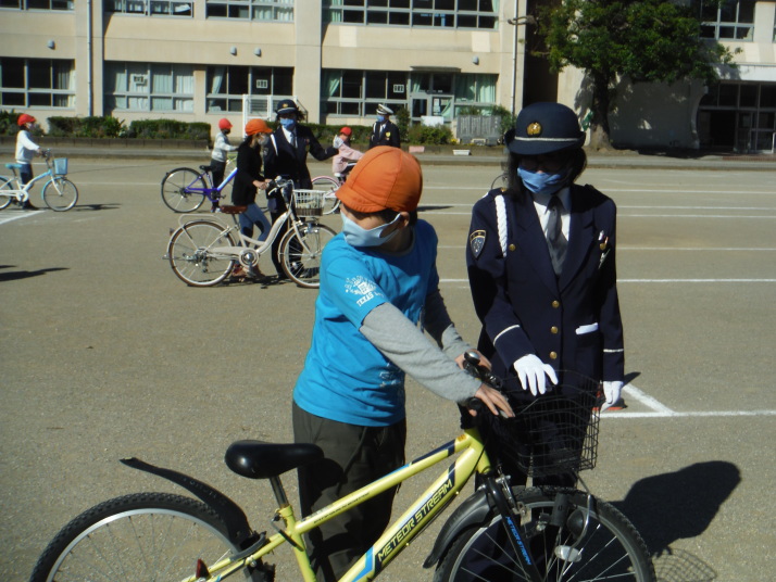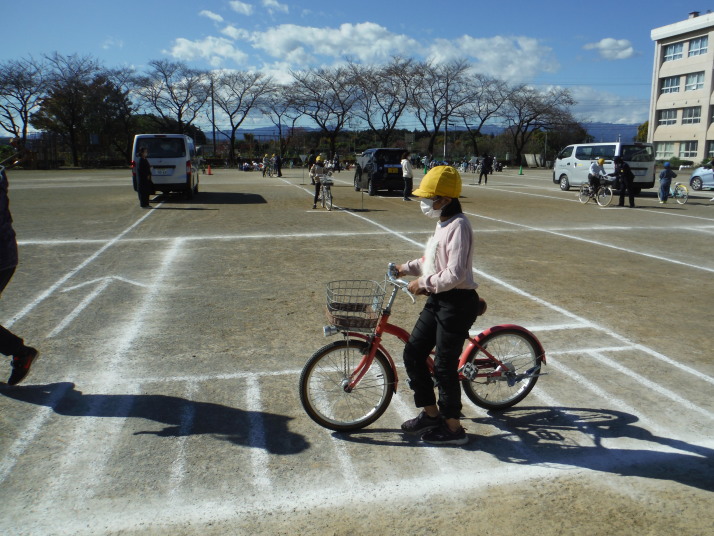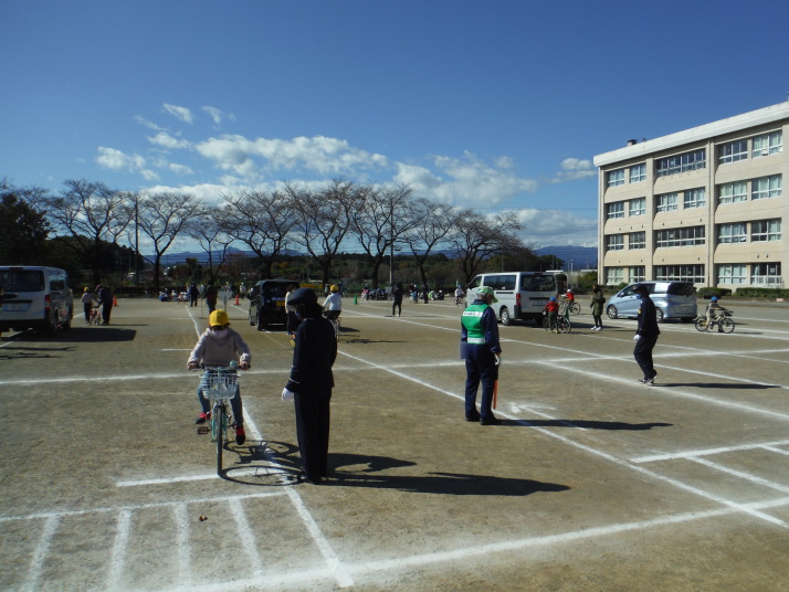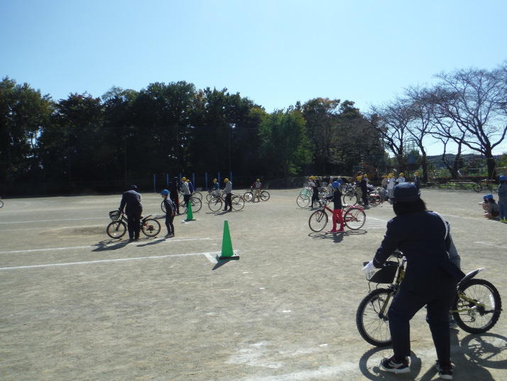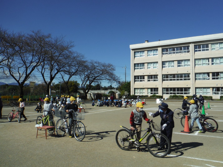 2つの学年ごとに分け、全学年を対象に行いました。笹井小学校の児童の多くは、西中学校に進学し、自転車通学に